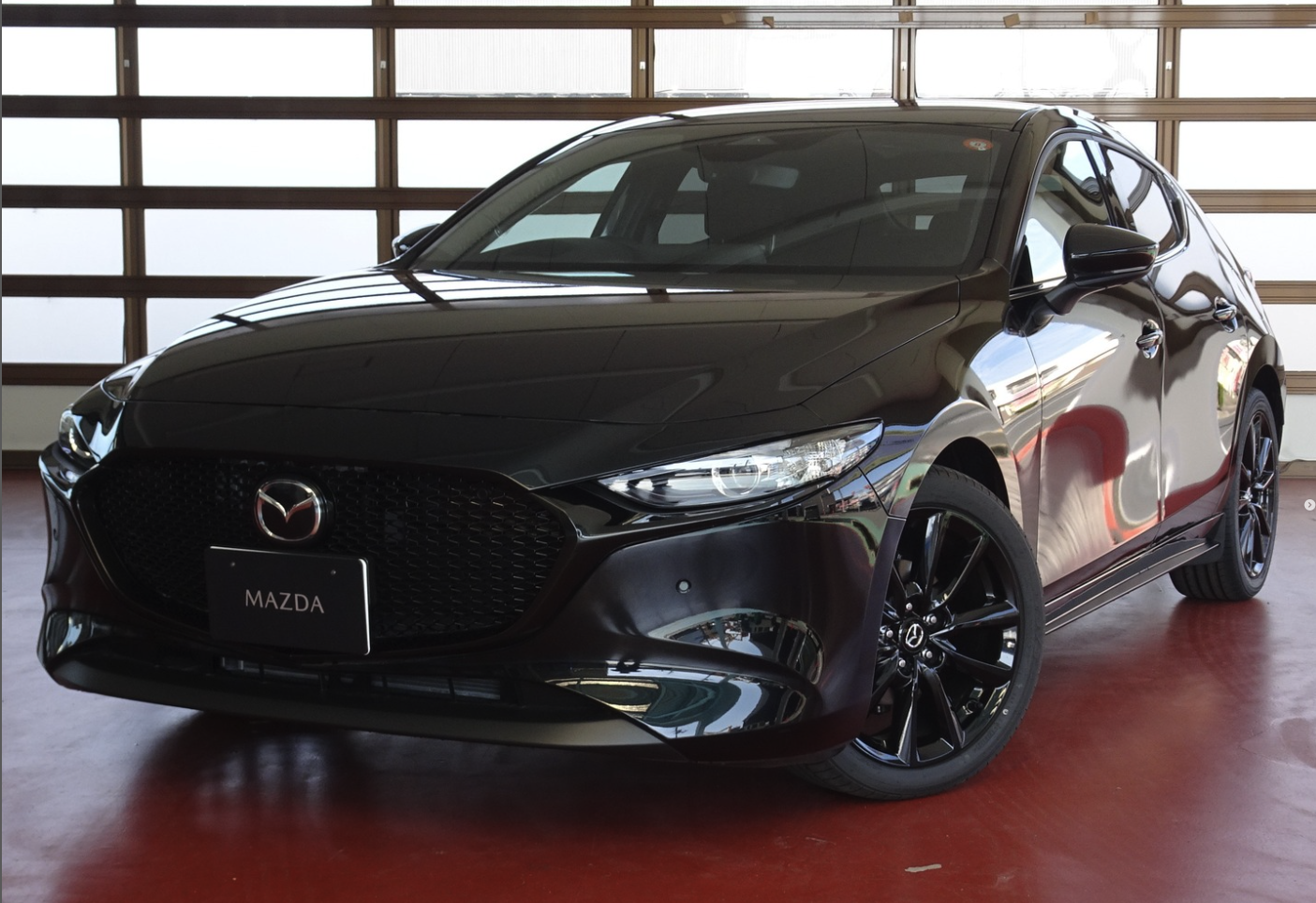 ジェットブラックマイカのカラーとブラックセレクションの組み合わせにより、全体が黒でまとめられていてMAZDA3の妖艶なスタイルをより一層高めています!!