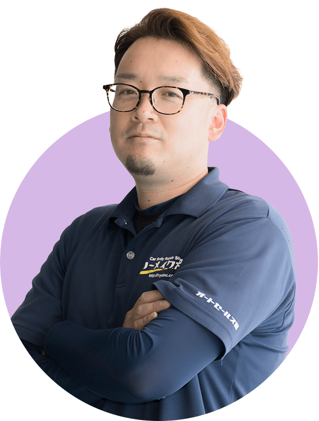 子どもの頃から車好き。チューニングカーにも興味があり、自動車専門学校を出て新卒入社しました。改造車を手がけたかったので配属先はカーメイク太田を希望。見学時に当時の工場長にフランクに接してもらい、ぜひここで働きたいと思いました。鈑金と塗装が分業制の会社が多いなか、オートセールス龍では両方できて、見積りやフロント業務もすべて任されるので、独立できるレベルのトータルスキルが身に付きます。風通しがよく、社長や役員との距離が近いこと、オン/オフをしっかり分けて、メリハリをつけて働けることも大きな魅力です。