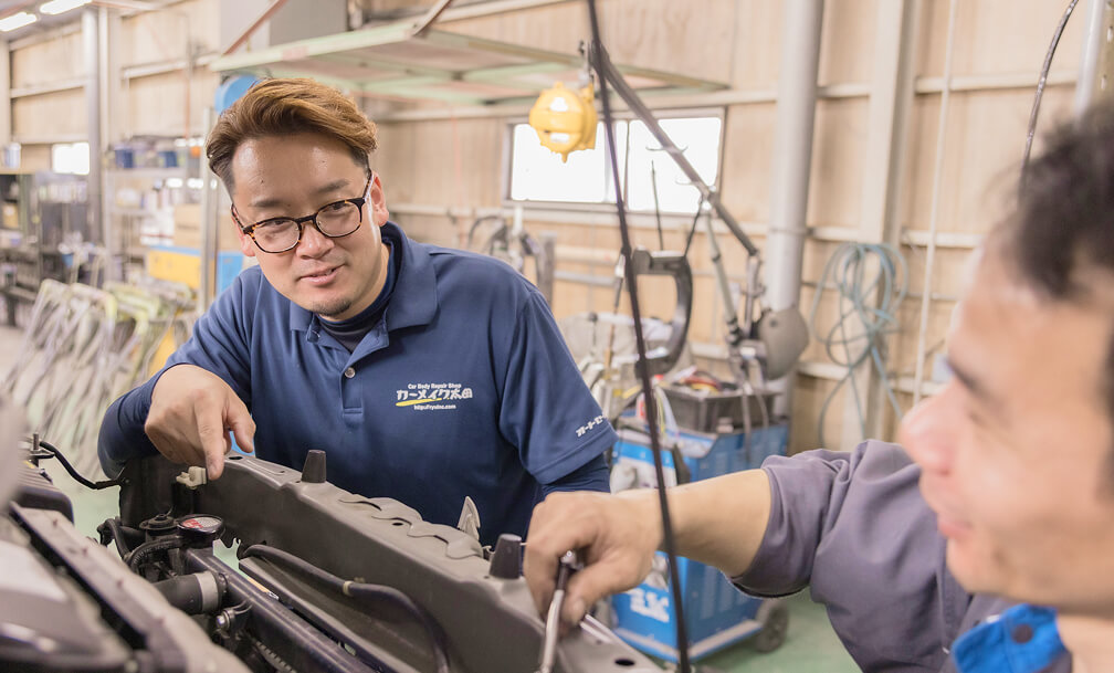 お客様の愛車に生じたフレームの損傷、ボディの傷や凹みを修復して塗装。本社工場、アートスマイル車検センター、カーメイク太田のすべてで、鈑金と塗装、どちらにも携われます。事故、経年劣化、飛び石による細かい傷など、車の外装へのダメージに対応するだけでなく、カスタムペイントによるドレスアップも手がけられ、センスを発揮できます。